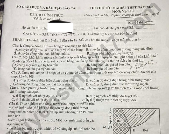Đề thi thử tốt nghiệp THPT môn Lý 2026 - Lào Cai
