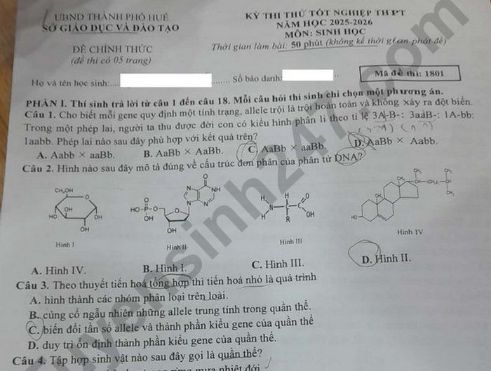 Đề thi thử tốt nghiệp THPT môn Sinh 2026 - TP Huế Câu 5. Người ta chuyển một số vi khuẩn E.coli mang các phân tử DNA vùng nhân chỉ chứa N sang môi trường chỉ có 1N. Các vi khuẩn nói trên thực hiện nhân đối ba lần liên tiếp tạo ra 1200 phân tử DNA vùng nhân chỉ chứa 14N. Sau đó chuyển các vi khuẩn sang môi trường chỉ chứa N và cho chúng nhân đôi tiếp hai lần nữa. Số phân tử DNA chỉ chứa 15N sau khi kết thúc quá trình nhân đôi trên là bao nhiêu? Câu 6. Ở cà chua, allele A qui định quả đỏ trội hoàn toàn so với allele a quả vàng; allele B kiểm soát sự tổng hợp chất diệp lục nên lá cỏ màu xanh trội hoàn toàn so với allele b mất khả năng này làm cho lá có màu vàng lưu huỳnh, biết rằng những cây cà chua có lá vàng lưu huỳnh đều chết ở giai đoạn mầm, không có quá trình đột biến xảy ra, các gene nằm trên NST thường. Trong phép lai AaBb x AaBb, người ta thu được 7680 cây cà chua sống sót. Số cây cà chua quả vàng là bao nhiêu cây? Lưu ý: Đáp án trong đề là bài làm của học sinh, có thể không chính xác