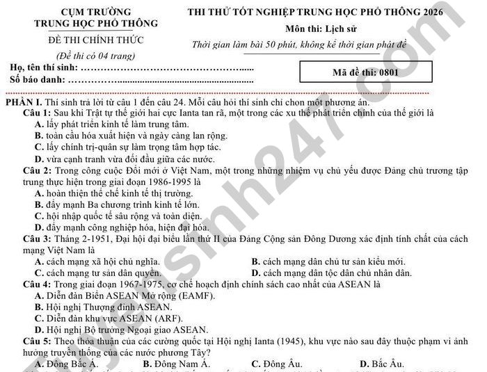 >>> Xem thêm lời giải chi tiết các đề thi thử Tốt nghiệp THPT 2026 môn Sử của các Sở GD, các trường THPT trên cả nước TẠI ĐÂY Theo TTHN 🔥 2K8 CHÚ Ý! LUYỆN THI TN THPT - ĐÁNH GIÁ NĂNG LỰC - ĐÁNH GIÁ TƯ DUY!