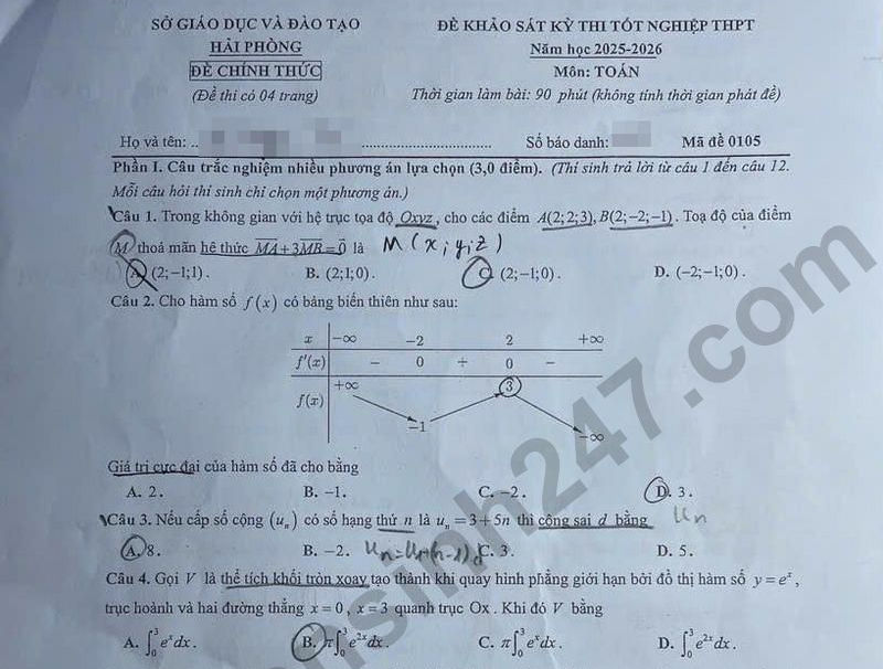 Đáp án Đề thi thử tốt nghiệp THPT môn Toán 2026 - Hải Phòng