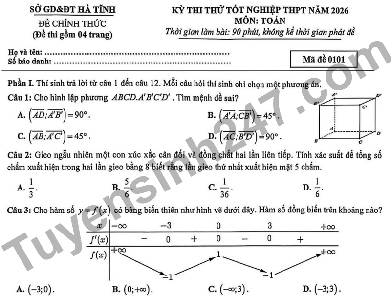 Đề thi thử tốt nghiệp THPT môn Toán sở GD&ĐT Hà Tĩnh năm 2026