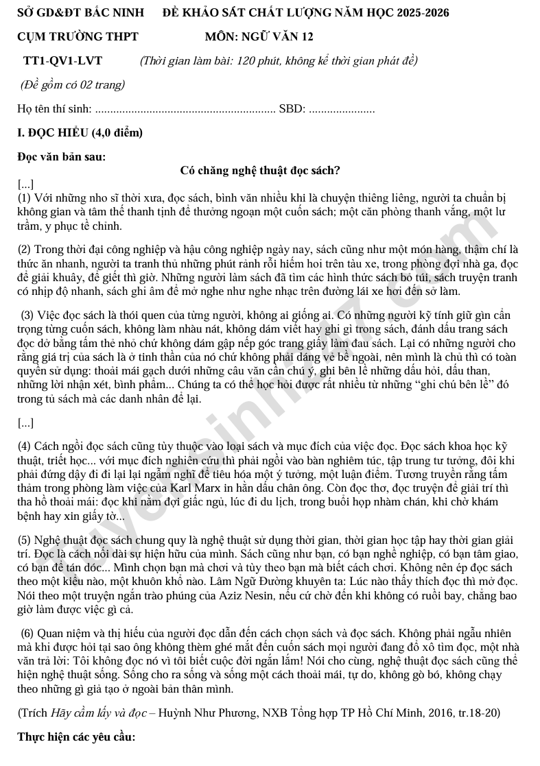 Đề thi thử tốt nghiệp THPT môn Văn 2026 - Cụm trường Bắc Ninh
