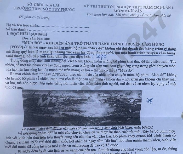 Đề thi thử tốt nghiệp THPT môn Văn 2026 lần 1 - THPT số 2 Tuy Phước Câu 3. Nêu tác dụng của yếu tố phi ngôn ngữ được sử dụng trong văn bản. Câu 4. Nhận xét về thái độ của người viết thể hiện trong văn bản. Câu 5. Từ nội dung thông tin: “Không phải những cuộc đọ súng hay tiếng bom đạn làm nên giá trị của 'Mưa đỏ', mà chính là những khoảnh khắc lặng - khi người lính nhận tin người đồng đội đã hi sinh, khi bác sĩ phải chọn cứu ai trước, khi mẹ ngồi khâu áo cho con dù chưa biết ngày trở về...", gợi cho anh/chị suy nghĩ gì về cách nhìn nhận chiến tranh của con người trong cuộc sống hiện đại? (Trả lời bằng 1 đoạn văn 5-7 dòng)