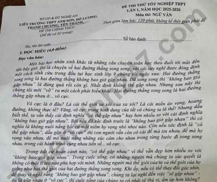 Đề thi thử tốt nghiệp THPT môn Văn 2026 - Liên trường Nghệ An (lần 1)