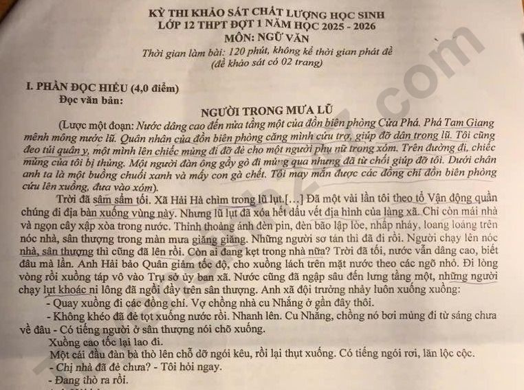 Đề thi thử tốt nghiệp THPT môn Văn 2026 - Phú Thọ (Đợt 1) Câu 1. Chỉ ra dấu hiệu nhận biết ngôi kể trong văn bản, nhạc Câu 2. Xác định không gian, thời gian xảy ra câu chuyện. Câu 3. Phân tích tác dụng của biện pháp tu từ liệt kê trong câu văn: Thỉnh thoảng ánh đèn pin, đèn bão lập lòe, nhấp nháy, loang loáng trên nóc nhà, sân thượng trong màn mưa giăng giăng Câu 4. Nhận xét hành động của những quân nhân đồn biên phòng Cửa Phá. Câu 5. Từ nội dung văn bản, anh/chị hãy trình bày suy nghĩ về tình người trong nghịch cảnh.