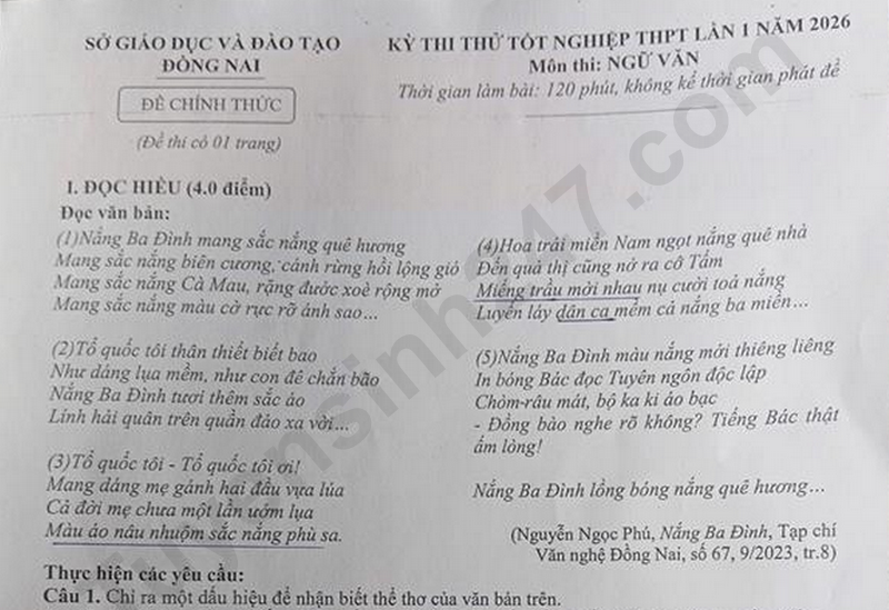 Đề thi thử tốt nghiệp THPT môn Văn 2026 - Sở GD Đồng Nai Câu 1. Chỉ ra một dấu hiệu để nhận biết thể thơ của văn bản trên. Câu 2. Xác định hai chi tiết trong khổ thơ thứ (4) gợi nhắc đến chiều sâu văn hóa truyền thống dân tộc. Câu 3. Phân tích tác dụng của biện pháp tu từ lặp cấu trúc trong khổ thơ (1). Câu 4. Anh/Chị hiểu như thể nào về hình ảnh Màu áo nâu nhuộm sắc nắng phù sa? Câu 5. Từ nội dung của hai dòng thơ: Tổ quốc tôi thân thiết biết bao/ Như dáng lụa mềm, như con đê chắn bão, anh/chị hãy rút ra thông điệp có ý nghĩa nhất đối với bản thân. (Trình bày ngắn gọn khoảng 5–7 dòng)