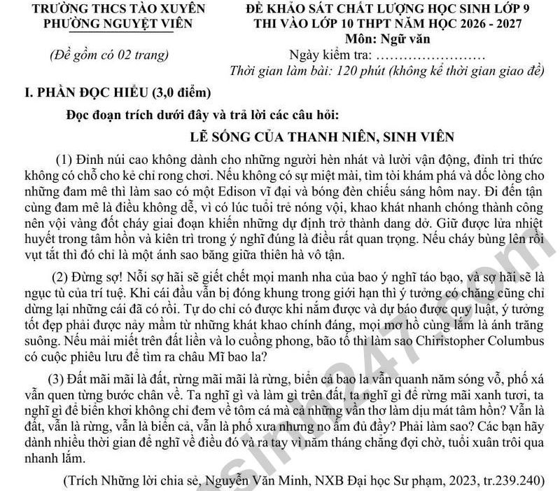 Đề thi thử Văn vào 10 năm 2026 trường THCS Tào Xuyên