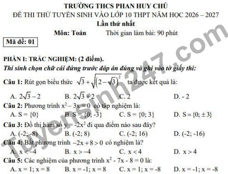Đáp án Đề thi thử vào 10 Trường THCS Phan Huy Chú năm 2026
