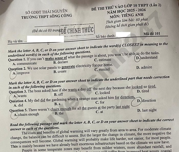 Đề thi thử vào lớp 10 lần 2 môn Anh 2026 - THPT Sông Công Read the following passage and mark the letter A, B, C, or D on your answer sheet to indicate the correct answer to each of the questions. The costs and benefits of global warming will vary greatly from area to area. For moderate climate change, the balance can be difficult to assess. But the larger the change in climate, the more negative the consequences will become. Global warming will probably make life harder, not easier, for most people. This is mainly because we have already built enormous infrastructure based on the climate we now have. People in some temperate zones may benefit from milder winters, more abundant rainfall, and expanding crop production zones. But people in other areas will suffer from increased heat waves, coastal erosion, rising sea level, more erratic rainfall, and droughts. Lưu ý: Đáp án khoanh trong đề là bài làm của học sinh, có thể không chính xác