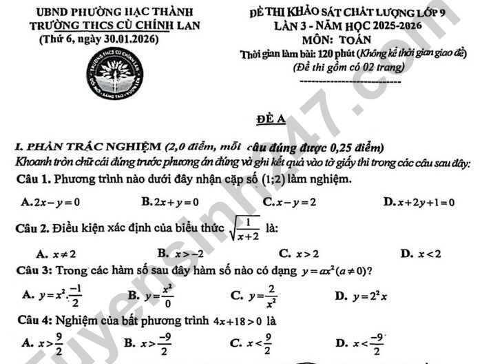 Đề thi thử vào lớp 10 môn Toán 2026 - THCS Cù Chính lan (lần 3) Câu 12(1,0 điểm): Bác Hà và cô Linh đi xe đạp từ làng lên tỉnh trên quãng đường dài 30 km, khởi hành cùng một lúc.Vận tốc xe của bác Hà lớn hơn vận tốc xe của cô Linh là 3 km/h nên bác Hà đi đến tinh trước cô Linh nửa giờ. Tính vận tốc xe của mỗi người. Câu 13 (1 điểm): Một chiếc thang AC được dựng vào một bức tường thẳng đứng (hình vẽ). Ban đầu khoảng cách từ chân thang đến tường là BC =1,3m và góc tạo bởi thang và phương nằm ngang là ACB = 66° . Tính độ dài của thang. Nếu đầu A của thang bị trượt xuống 40cm đến vị trí D thì góc DEB tạo bởi thang và phương nằm ngang bằng bao nhiêu? (Kết quả độ dài, số đo góc làm tròn đến hàng phần trăm)