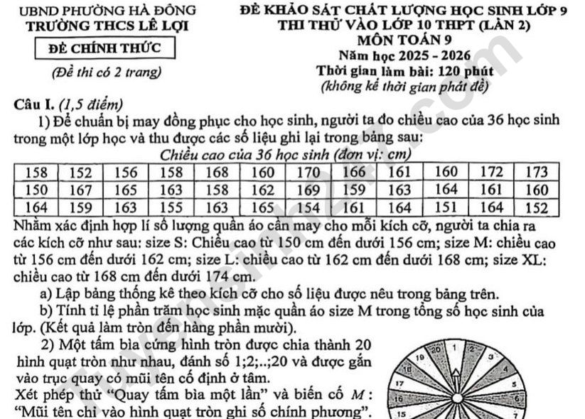 Đề thi thử vào lớp 10 môn Toán 2026 - THCS Lê Lợi lần 2 2) Một tấm bìa cứng hình tròn được chia thành 20 hình quạt tròn như nhau, đánh số 1;2;..;20 và được gắn vào trục quay có mũi tên cố định ở tâm. Xét phép thử “Quay tấm bìa một lần” và biến cố M: “Mũi tên chỉ vào hình quạt tròn ghi số chính phương”. Tính xác suất của biến cố M . (Biết mỗi lần quay thì mũi tên chỉ rơi vào đúng một trong các hình quạt nhỏ trong số 20 hình quạt trên)