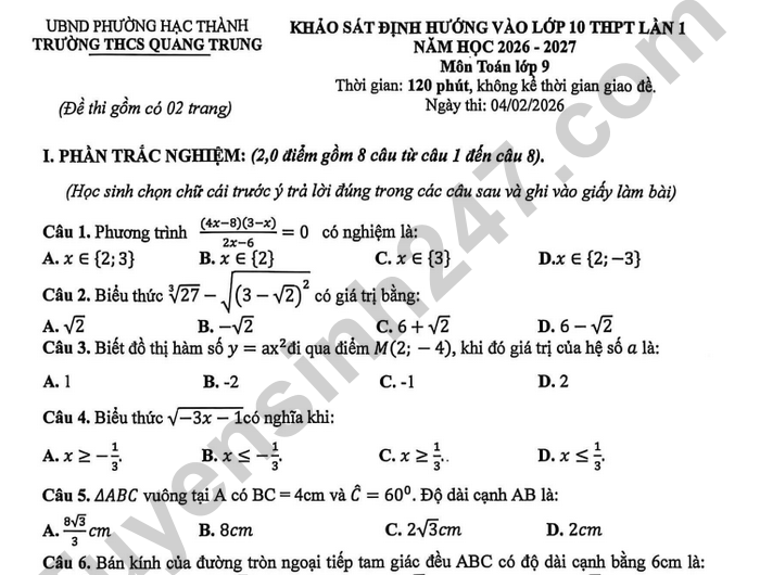 Đề thi thử vào lớp 10 môn Toán 2026 - THCS Quang Trung Câu 14. (2,0 điểm) Cho đường tròn (O) có hai đường kính AB và MN vuông góc với nhau. Trên tia đối của tia MA lấy điểm C khác điểm M. Kẻ MH vuông góc với BC (H thuộc BC). a) Chứng minh tứ giác BOMH nội tiếp một đường tròn. Tìm tâm và bán kính của đường tròn này. b) MB cắt OH tại E. Chứng minh: ME.MH=BE.HC c) Gọi giao điểm của đường tròn (O) với đường tròn ngoại tiếp AMHC là K. Chứng minh ba điểm C, K, E thẳng hàng. Câu 15. (0,5 điểm): Một miếng tôn hình tam giác có diện tích là S. Người thợ làm biển quảng cáo muốn cắt ra một hình bình hành (một đỉnh là đỉnh của tam giác và ba đỉnh còn lại nằm trên ba cạnh tam giác). Hỏi hình bình hành mà người thợ cắt ra có thể đạt diện tích lớn nhất là bao nhiêu?