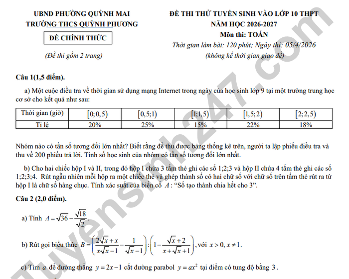 Đề thi thử vào lớp 10 môn Toán 2026 - THCS Quỳnh Phương (có đáp án) Nhóm nào có tần số tương đối lớn nhất? Biết rằng đề thu được bảng thống kê trên, người ta lập phiếu điều tra và thu về 200 phiếu trả lời. Tính số học sinh của nhóm có tần số tương đối lớn nhất. b) Cho hai chiếc hộp I và II, trong đó hộp I chứa 3 tấm thẻ ghi các số 1;2;3 và hộp II chứa 4 tấm thẻ ghi các số 1;2;3;4. Rút ngẫu nhiên mỗi hộp ra một chiếc thẻ và ghép thành số có hai chữ số với chữ số trên tấm thể rút ra từ hộp I là chữ số hàng chục. Tính xác suất của biến cố 4: “Số tạo thành chia hết cho 3”.