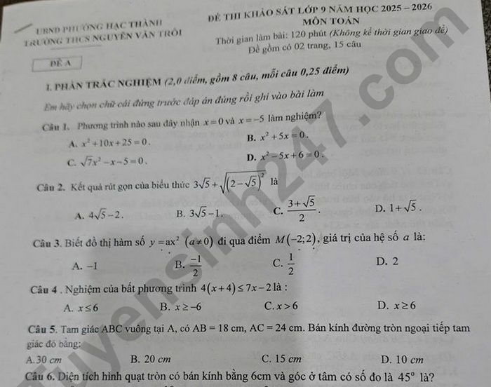 Đề thi thử vào lớp 10 môn Toán - THCS Nguyễn Văn Trỗi 2026 Câu 15. (0,5 điểm) Một công ty vận tải trên địa bàn phường Hạc Thành chuyên cho thuê xe và đang có 100 chiếc xe cho thuê . Hiện tại, giá thuê mỗi chiếc xe là 500 nghìn đồng một ngày và tất cả các xe đều được thuê hết. Biết rằng, cứ mỗi lần công ty tăng giá thuê xe thêm 50 nghìn đồng mỗi ngày thì sẽ có 5 chiếc xe không được thuê nữa. Hỏi công ty nên tăng giá thuê xe thành bao nhiêu để doanh thu của công ty trong một ngày là lớn nhất ?