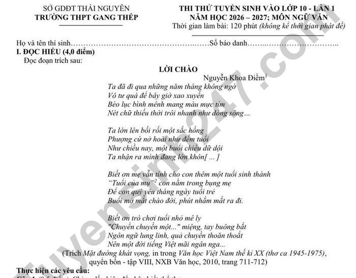 Đề thi thử vào lớp 10 môn Văn 2026 lần 1 - THPT Gang Thép (có đáp án) II. VIẾT (6,0 điểm) Câu 1 (2,0 điểm). Viết đoạn văn (khoảng 150 chữ) phân tích tỉnh cảm của nhân vật trữ tình “ta” trong đoạn trích trong phần Đọc hiểu. Câu 2 (4,0 điểm). Trong nhịp sống hiện đại, chúng ta hôm nay được thừa hưởng cuộc sống đầy đủ, tiện nghi và những cơ hội phát triển. Thành quả ấy không tự nhiên có mà đó là kết tinh của biết bao công sức và sự hi sinh của cha anh đi trước. Hãy viết bài văn (khoảng 600 chữ) trình bày suy nghĩ của em về lòng biết ơn của thế hệ trẻ đối với thế hệ cha anh.