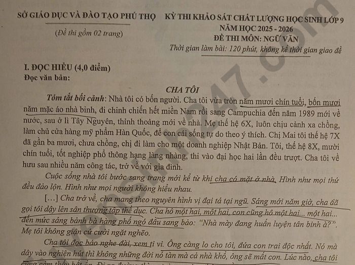 Đề thi thử vào lớp 10 môn Văn - Phú Thọ 2026 Câu 1 (0,5 điểm). Xác định ngôi kể của người kể chuyện trong văn bản trên. Câu 2 (0,5 điểm). Chỉ ra lời người kể chuyện và lời nhân vật trong các câu văn sau: Sáng mới năm giờ, cha đã gọi tôi dậy lên sân thượng tập thể dục. Cha hồ một hai, một hai, con cũng hô một hai ... một hai... đến mức sáng bành bà hàng phố ngỏ đầu sang bảo: "Nhà mày đang huấn luyện tân binh à? ”. Mẹ tôi không giận cứ cười ngặt nghẽo. Câu 3 (1,0 điểm). Phân tích hiệu quả của việc sử dụng phép nối trong đoạn văn sau: Hình ảnh cha vận sắc phục nhà binh, đeo quân hàm đỏ chói, bàn tay to đầy thô dắt đứa con gái nhỏ bé lích chích đi tha thẩn, nhàn hạ, thanh bình trên triền đê đầy hoa cỏ may cứ đi theo chị tôi suốt tuổi thơ đến bây giờ. Nhưng, ám ảnh, sợ hãi nhất là khi cha khoác ba lô trả phép.