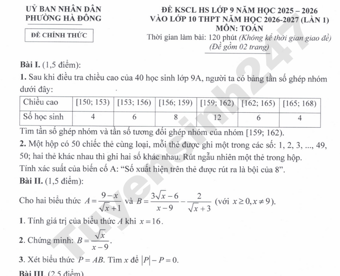 Đề thi thử vào lớp 10 năm 2026 môn Toán - Phường Hà Đông (lần 1) 1. Lúc 6 giờ 30 phút sáng, một ca-nô chở hàng đi xuôi dòng từ A đến B dài 48km. Khi đến B, ca-nô nghỉ 30 phút để bốc dỡ hàng sau đó lại đi ngược dòng từ B đến C dài 30km. Ca-nô đến C lúc 10 giờ 30 phút buổi sáng cùng ngày. Tìm vận tốc của ca-nô khi nước yên lặng, biết vận tốc dòng nước là 2km/h và vận tốc ca-nô khi nước yên lặng không thay đổi trong suốt quá trình chuyển động của ca-nô. 2. Một công ty ra mắt hai sản phẩm A và B với tổng giá niêm yết là 7,5 triệu đồng. Ngày đầu khai trương cửa hàng, công ty có chương trình khuyến mãi giảm 20% cho sản phẩm A và 25% cho sản phẩm B so với giá niêm yết. Một khách hàng mua 2 sản phẩm A và 3 sản phẩm B trong ngày đầu khai trương nên số tiền phải trả là 14,6 triệu đồng. Hỏi giá niêm yết của mỗi sản phẩm A và B?