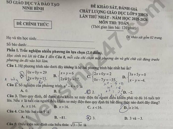 Đề thi thử vào lớp 10 năm 2026 môn Toán - Sở GD Ninh Bình lần 1 a) Cuối tuần, bạn An lên kế hoạch chạy bộ trong hai ngày nghỉ (thứ Bảy và Chủ nhật), dự kiến An chạy tổng cộng ít nhất 9.000m vào các buổi sáng và chiều của mỗi ngày. Mỗi buổi sáng An chạy 2 500 m. Gọi a là số mét An chạy vào mỗi buổi chiều. Viết bất phương trình với ẩn a biểu thị điều kiện để bạn An chạy đảm bảo đủ số mét dự kiến theo kế hoạch đã đề ra. b) Bác Minh vào cửa hàng tạp hóa để mua 30 quyển vở và 12 cây bút với tổng số tiền phải trả theo giá niêm yết là 420 000 đồng. Nhân dịp kỉ niệm Ngày Quốc khánh 2/9, cửa hàng tạp hóa giảm giá mỗi quyển vở 15% và mỗi cây bút 10% so với giá niêm yết. Khi thanh toán tiền, bác Minh đưa 400.000 đồng và được trả lại 40 000 đồng. Tính giá niêm yết của một quyển vở và một cây bút.