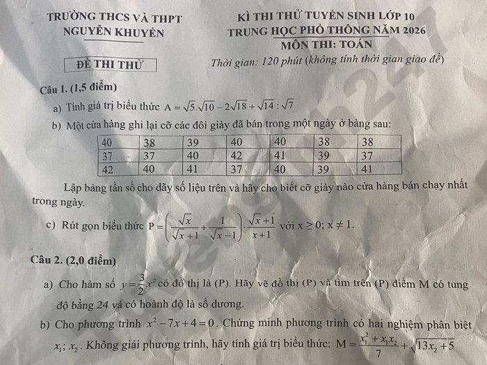 Đề thi thử vào lớp 10 năm 2026 môn Toán - THCS và THPT Nguyễn Khuyến a) Một chiếc xe tải dự định chờ một số kiện hàng giống nhau, mỗi kiện hàng nặng 800kg đi qua một chiếc cầu có ghi bảng chỉ dẫn tổng trọng lượng của mỗi xe không vượt quá 25 tấn. Tính xem chiếc xe này cho tối đa bao nhiêu kiện hàng biết rằng trọng lượng của xe khi không chở hàng là 4 tấn (kể cả trọng lượng người trên xe). b) Năm ngoái hai đơn vị sản xuất nông nghiệp thu hoạch được 3600 tấn thóc. Năm nay, hai đơn vị thu hoạch được 4095 tấn thóc. Hỏi năm nay, mỗi đơn vị thu hoạch được bao nhiêu tấn thóc, biết rằng năm nay, đơn vị thứ nhất làm vượt mức 15% và đơn vị thứ hai vượt mức 12% so với năm ngoái.