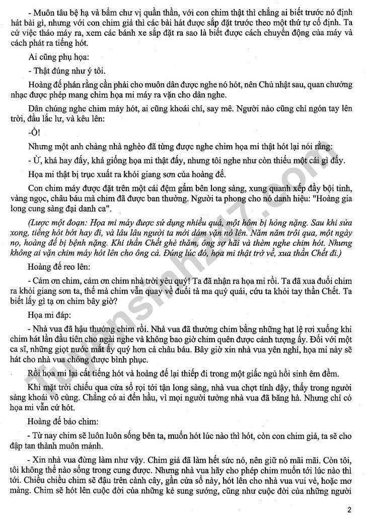 Đề thi vào lớp 10 môn Văn không chuyên - Phổ thông năng khiếu HCM 2025 PHẦN TỰ LUẬN Câu 6 (0.75 điểm): Trong văn bản, khi nghe chim họa mi máy hót, một nhân vật đã nói: “Ừ, khá hay đấy, khá giống họa mi thật đấy, nhưng tôi nghe như còn thiếu một cái gì đấy.” Câu 7 (0.75 điểm): Xác định vai trò của chi tiết sau trong việc thể hiện nội dung của tác phẩm (Viết từ 6 đến 8 dòng): “Chim sẽ hót lên cuộc đời của những kẻ sung sướng, cũng như cuộc đời của những người >> Tải đề thi TẠI ĐÂY TẠI ĐÂY