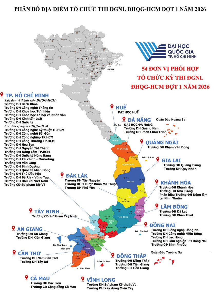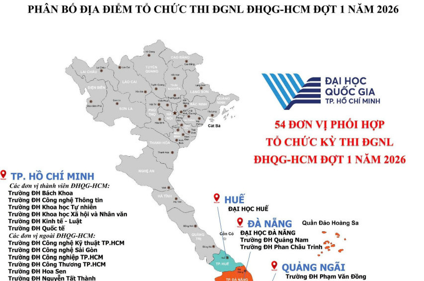Ngày 24/1, Đại học Quốc gia TPHCM mở cổng đăng ký thi Đánh giá năng lực TPHCM năm 2026 đợt 1. Thí sinh đăng ký tài khoản và đăng ký địa điểm thi phù hợp. >> XEM THÊM: LỊCH ĐĂNG KÝ THI VÀ LỊCH THI ĐGNL HCM 2026 TẠI ĐÂY Danh sách địa điểm thi Đánh giá năng lực ĐH Quốc gia HCM năm 2026 đợt 1 I. TẠI TP. HỒ CHÍ MINH (22 địa điểm) - Các đơn vị thành viên ĐHQG-HCM: Trường ĐH Bách Khoa Trường ĐH Công nghệ Thông tin Trường ĐH Khoa học Tự nhiên Trường ĐH Khoa học Xã hội và Nhân văn Trường ĐH Kinh tế - Luật Trường ĐH Quốc tế - Các đơn vị ngoài ĐHQG-HCM: Trường ĐH Công nghệ Kỹ thuật TP.HCM Trường ĐH Công nghệ Sài Gòn Trường ĐH Công nghiệp TP.HCM Trường ĐH Công Thương TP.HCM Trường ĐH Hoa Sen Trường ĐH Nguyễn Tất Thành Trường ĐH Nông Lâm TP.HCM Trường ĐH Quốc tế Hồng Bàng Trường ĐH Tài chính - Marketing Trường ĐH Văn Lang Trường ĐH Bình Dương Trường ĐH Quốc tế Miền Đông Trường ĐH Thủ Dầu Một Trường ĐH Bà Rịa - Vũng Tàu Trường ĐH Dầu khí Việt Nam Trường CĐ Sư phạm BR-VT ...