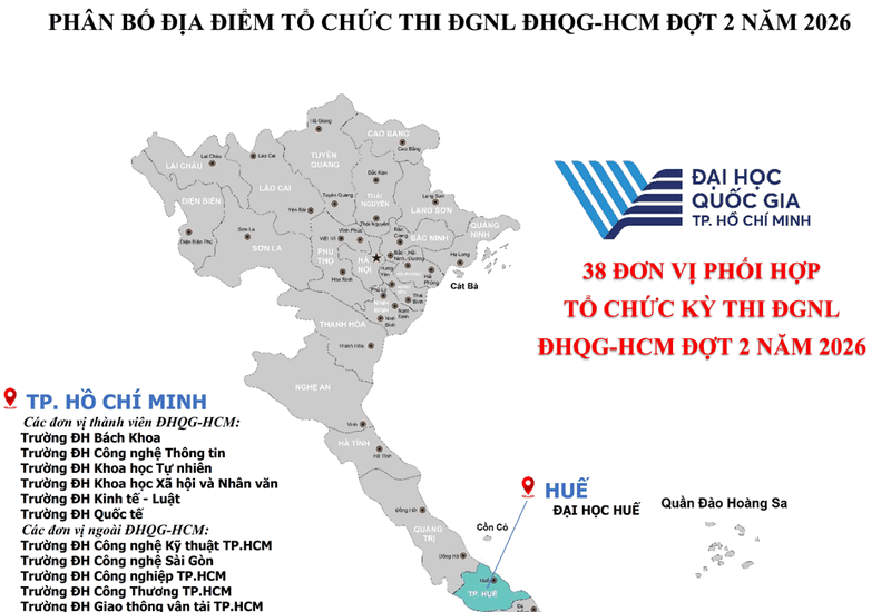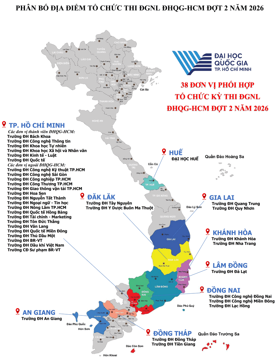 Ngày 18/4, Đại học Quốc gia TPHCM mở cổng đăng ký thi Đánh giá năng lực TPHCM năm 2026 đợt 2. Thí sinh đăng ký tài khoản và đăng ký địa điểm thi phù hợp. >> Xem Video hướng dẫn đăng ký thi ĐGNL HCM 2026 Tại đây Kỳ thi đánh giá năng lực ĐH Quốc gia TP.HCM đợt 2 năm 2026 sẽ diễn ra sáng 24-5 tại: TP.HCM, Huế, Gia Lai, Đắk Lắk, Khánh Hòa, Lâm Đồng, Đồng Nai, Đồng Tháp và An Giang (theo đơn vị hành chính cấp tỉnh sau sáp nhập). Danh sách địa điểm thi Đánh giá năng lực ĐH Quốc gia HCM đợt 2 năm 2026