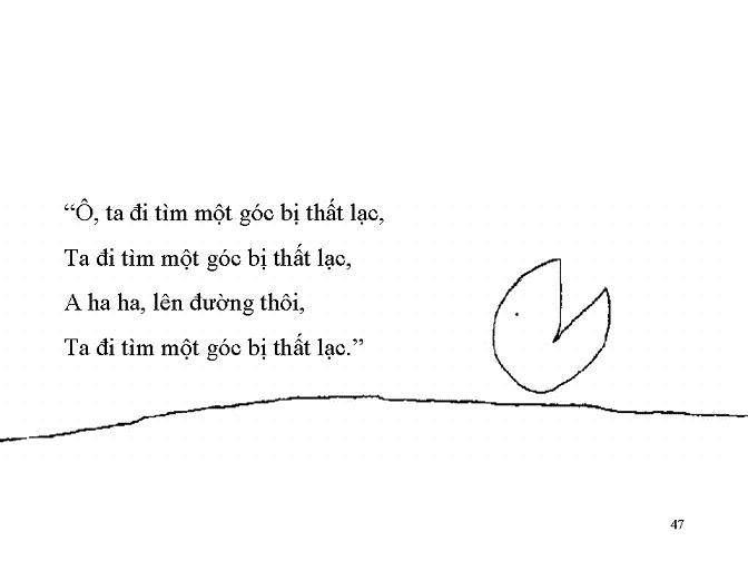 Câu chuyện ngụ ngôn về “thiếu” và “đủ” Hắn thiếu 1 góc, và hắn rất buồn về điều đó. Hắn bắt đầu đi tìm góc còn thiếu của mình. Hắn đi về phía trước, hát mấy câu hát thế nầy: “Ô, ta đi tìm 1 góc bị thất lạc, Đi qua cả chân trời góc bể, Hành trình vạn lý không sợ xa xôi, Ta đi tìm 1 góc bị thất lạc...” Có lúc, hắn phải chịu cái nắng thiêu đốt của mặt trời, Tiếp đó lại là trận mưa lạnh, Có lúc bị tuyết làm cho lạnh cóng. Nhưng sau đó mặt trời lại hiện ra sưởi ấm hắn. Có lẽ vì hắn thiếu 1 góc không thể lăn nhanh được. Nên đôi lúc dừng lại nói chuyện với bác giun, Hoặc hít hà hương thơm của hoa, Cũng có lúc hắn lăn nhanh, vượt qua cả bọ cánh cứng, Cũng có lúc để bọ cánh cứng vượt qua. Khi vui, chính là những lúc thế nầy đây... Hắn tiếp tục đi, vượt qua cả biển lớn. “Ô, ta đi tìm 1 góc bị thất lạc, Đi qua cả chân trời góc bể, Hành trình vạn lý không sợ xa xôi, Ta đi tìm 1 góc bị thất lạc”. Vượt qua cả ao sâu, rừng rậm. Trèo đèo, Trượt dốc, Cho đến 1 ngày, xem nầy! “Ta đã tìm thấy 1 góc bị thất lạc rồi.” Hắn reo lên! “Ta đã tìm thấy góc bị thất lạc, Hành trình vạn lý không sợ xa xôi Ta tìm thấy rồi...” “Chờ chút đã” Cái góc nhỏ nói “Đừng có hát cái gì đường xá xa xôi...” “Tôi không phải là cái góc bị thất lạc của anh, Tôi không phải là cái góc của ai cả. Tôi là góc của riêng tôi . Cho dù là góc bị thất lạc của ai đó đi chăng nữa, Tin chắc tôi không phải là của anh.” “Ồ”, Hắn buồn buồn nói “Xin lỗi đã làm phiền” Hắn lại tiếp tục lên đường Hắn tìm thấy 1 góc khác, Nhưng lại nhỏ quá!