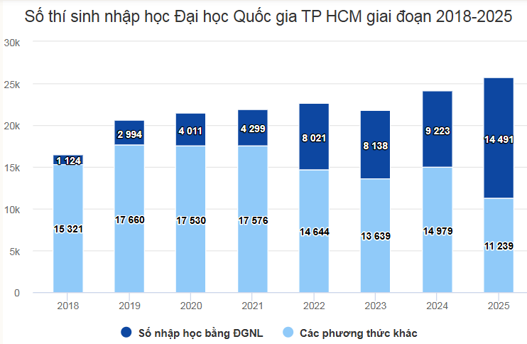 Đại học Quốc gia TP HCM chiều 5/12 cho biết thông tin trên. Cụ thể, năm 2025, chỉ tiêu toàn đại học là hơn 25.700. Trong đó, gần 14.500 em nhập học bằng phương thức đánh giá năng lực (kỳ thi V-ACT). Năm 2018 - năm đầu tiên tổ chức V-ACT, số thí sinh nhập học bằng phương thức này chỉ hơn 1.100, chiếm chưa đến 7% tổng số tân sinh viên. Còn so với năm ngoái, tỷ lệ thí sinh vào trường bằng phương thức này cũng tăng hơn 18%. Kỳ thi đánh giá năng lực của Đại học Quốc gia TP HCM là kỳ thi lớn nhất do các trường đại học tổ chức. Năm 2025, khoảng 152.800 thí sinh tham gia với hơn 223.000 lượt dự thi. Kết quả được hơn 110 trường dùng để xét tuyển đầu vào. Điểm trung bình chung kỳ thi V-ACT năm 2025 là 662,78. Thủ khoa đạt 1122/1200 điểm. Bài thi thấp nhất đạt 120 điểm. Điểm chuẩn theo dựa vào kết quả kỳ thi này vào 8 trường thành viên cao nhất là 1098, ở ngành Trí tuệ nhân tạo thuộc trường Đại học Công nghệ thông tin (UIT). ![]() Ngoài xét điểm V-ACT, các phương thức tuyển sinh chủ đạo của Đại học Quốc gia TP HCM là: tuyển thẳng, ưu tiên xét tuyển, xét điểm thi tốt nghiệp THPT. Riêng trường Đại học Bách khoa xét kết hợp điểm học bạ, đánh giá năng lực và thi tốt nghiệp THPT cộng thành tích khác. Học phí chương trình chuẩn của các trường khoảng 16,6-70 triệu đồng một năm. Năm 2026, Đại học Quốc gia TP HCM sẽ tổ chức hai đợt thi đánh giá năng lực vào đầu tháng 4 và cuối tháng 5, thí sinh bắt đầu đăng ký từ cuối tháng 1/2026. >> XEM CHI TIẾT LỊCH THI ĐGNL HCM 2026 TẠI ĐÂY Theo Báo Vnexpress DÀNH CHO 2K8 – ÔN THI ĐÁNH GIÁ NĂNG LỰC 2026!Bài thi Đánh giá năng lực 2026 thay đổi toàn bộ từ cấu trúc bài thi, các dạng câu hỏi,.... mà bạn chưa biết phải ôn tập như thế nào cho hiệu quả? không học môn đó thì làm bài ra sao? Bạn cần phương pháp ôn tập và làm bài thi từ những người am hiểu về kì thi và đề thi? Bạn cần thầy cô đồng hành suốt quá trình ôn luyện? Vậy thì hãy xem ngay lộ trình ôn thi bài bản tại ON.TUYENSINH247.COM: