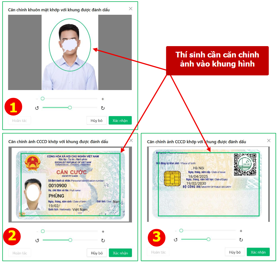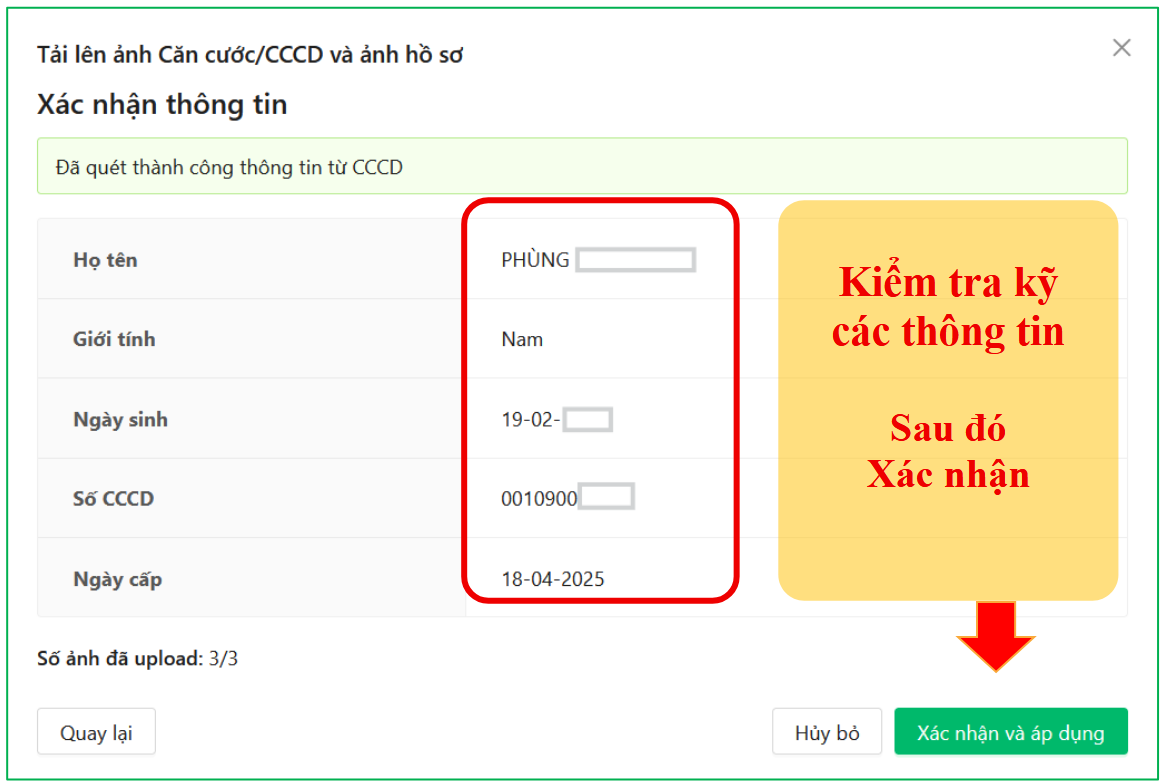 Hình 13. Hệ thống tự động quét thông tin từ mã QR code trên thẻ căn cước của thí sinh Sau khi hệ thống quét QR code từ ảnh thẻ Căn cước thành công, hệ thống sẽ tự động nhập các thông tin thí sinh tương ứng bao gồm: Họ và tên; Giới tính; Ngày sinh; Số căn cước, Ngày cấp. Thí sinh cần kiểm tra kỹ, ấn xác nhận và áp dụng.