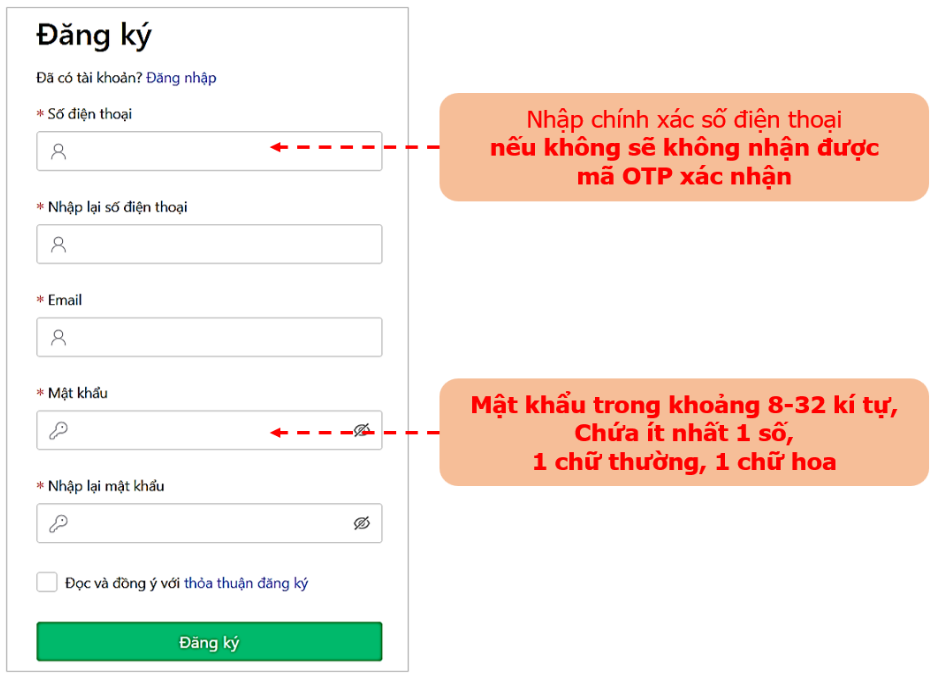 Hình 1. Giao diện màn hình đăng ký và đăng nhập tài khoản thi HSA Thí sinh nhập chính xác số điện thoại đăng ký để nhận mã OTP xác thực tài khoản. Số điện thoại là duy nhất và không thể thay đổi. Thí sinh chỉ sử dụng địa chỉ email đang hoạt động để đăng ký tài khoản. Đơn vị tổ chức thi sẽ liên hệ, thông báo thông tin về kỳ thi HSA qua email đăng ký. Trường hợp không nhận được email trong mục Hòm thư (Inbox), thí sinh kiểm tra trong mục Thư rác (Spam). Thí sinh phải đọc “Thỏa thuận giữa thí sinh và Viện Đào tạo số và Khảo thí” và tích chọn Đồng ý để thực hiện các bước tiếp theo. Thỏa thuận là yêu cầu bắt buộc phải tuân thủ để tham dự kỳ thi HSA.