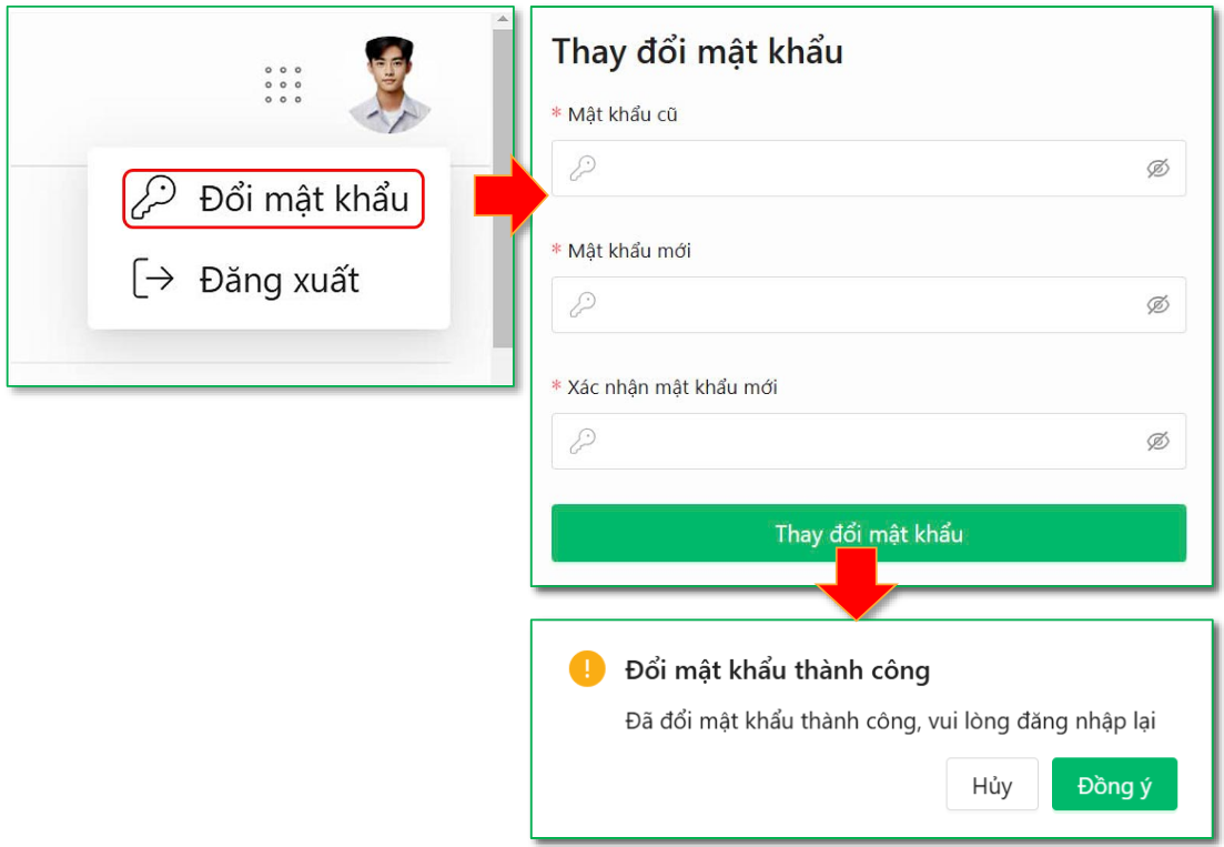 Hình 9. Đổi mật khẩu tài khoản thi HSA. BƯỚC 3. Cập nhật hồ sơ dự thiSau khi đăng nhập thành công, thí sinh cập nhật hồ sơ, Tải lên ảnh Căn cước/ CCCD và ảnh hồ sơ gồm: I. Thông tin cá nhân; II. Căn cước; III. Địa chỉ nhận phiếu báo điểm; IV. Học bạ THPT;V. Thông tin nguyện vọng. Thông tin của thí sinh phải chính xác để sử dụng làm Phiếu báo dự thi và Phiếu báo điểm. Các trường thông tin có dấu sao (*) là bắt buộc.