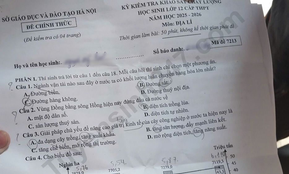 Đề thi khảo sát lớp 12 môn Địa 2026 - Sở GD Hà Nội