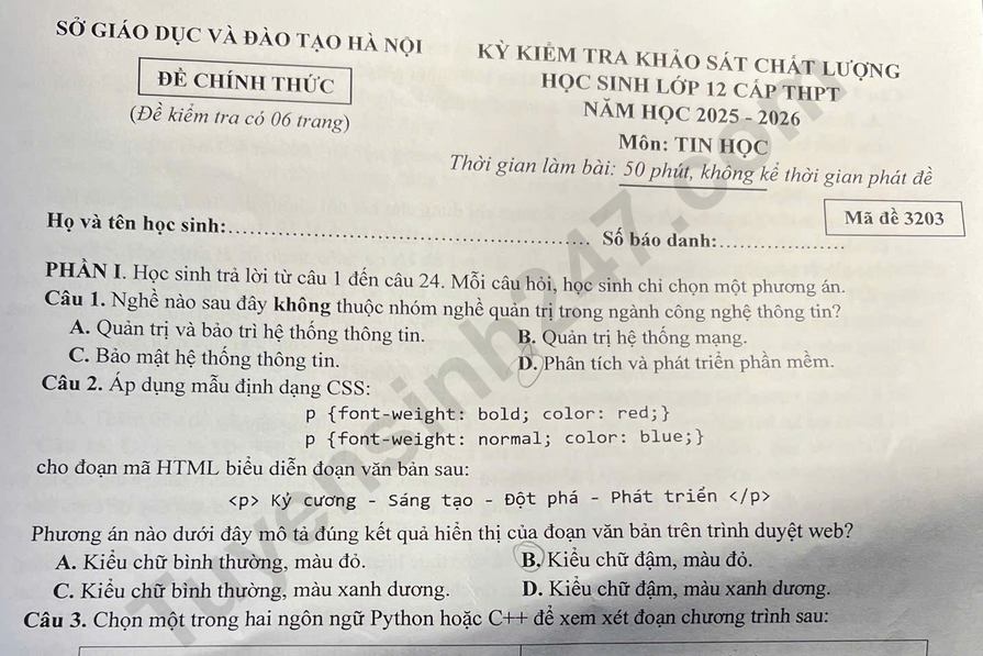 Đề thi khảo sát lớp 12 môn Tin - Hà Nội 2026