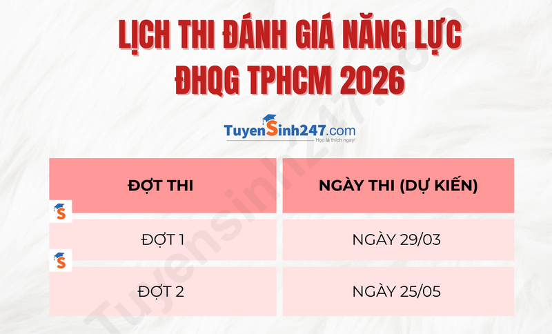 Thông tin từ Đại học Quốc gia TPHCM, kỳ thi đánh giá năng lực năm 2026 của đơn vị này vẫn tiếp tục được tổ chức 2 đợt như mọi năm nhưng có sự điều chỉnh về mặt thời gian. Lịch thi Đánh giá năng lực HCM 2026 dự kiến như sau: - Thi Đánh giá năng lực HCM đợt 1: vào chủ nhật tuần cuối tháng 3 (Dự kiến ngày 29/3) - Thi Đánh giá năng lực HCM đợt 2: dự kiến tổ chức sớm hơn 1 tuần so với năm 2025 (dự kiến ngày 25/5) Lý giải từ Đại học Quốc gia TPHCM, việc điều chỉnh thời gian đợt 2 của kỳ thi nhằm phù hợp với lịch trình chung của Bộ GD&ĐT, tạo điều kiện thuận lợi cho thí sinh dự thi. Theo khung kế hoạch thời gian năm học 2025-2026 của Bộ GD&ĐT, kỳ thi tốt nghiệp THPT 2026 dự kiến diễn ra vào ngày 11-12/6, sớm hơn 15 ngày so với năm 2025. Năm 2025, tính cả hai đợt thi của kỳ thi này có đến gần 153.000 thí sinh dự thi, tương ứng với hơn 223.000 lượt thi. Có trên 110 trường đại học, cao đẳng trong cả nước lấy kết quả kỳ thi đánh giá năng lực của Đại học Quốc gia TPHCM xét tuyển đầu vào. >> XEM THÊM DANH SÁCH TRƯỜNG XÉT ĐIỂM THI ĐÁNH GIÁ NĂNG LỰC HCM MỚI NHẤT TẠI ĐÂY Về cấu trúc đề thi của kỳ thi đánh giá năng lực sẽ không thay đổi so với năm 2025. Đề thi vẫn bao gồm 120 câu hỏi trắc nghiệm khách quan đa lựa chọn với 150 phút làm bài và thực hiện thi trên giấy. Kết quả thi được xác định bằng phương pháp trắc nghiệm hiện đại theo lý thuyết ứng đáp câu hỏi. Điểm của từng câu hỏi có trọng số khác nhau tùy thuộc vào độ khó của câu hỏi. Điểm thi được quy đổi theo từng phần. Điểm số tối đa của bài thi là 1.200 điểm, trong đó điểm tối đa từng thành phần của bài thi tiếng Việt, tiếng Anh, toán, tư duy khoa học đều là 300 điểm. Đến nay, kỳ thi đánh giá năng lực của Đại học Quốc gia TPHCM là kỳ thi trực tiếp lấy điểm xét tuyển vào đại học có quy mô lớn nhất cả nước về số lượng thí sinh dự thi và số trường lấy điểm xét tuyển. Theo Báo Dân Trí DÀNH CHO 2K8 – ÔN THI ĐÁNH GIÁ NĂNG LỰC 2026!Bài thi Đánh giá năng lực 2026 thay đổi toàn bộ từ cấu trúc bài thi, các dạng câu hỏi,.... mà bạn chưa biết phải ôn tập như thế nào cho hiệu quả? không học môn đó thì làm bài ra sao? Bạn cần phương pháp ôn tập và làm bài thi từ những người am hiểu về kì thi và đề thi? Bạn cần thầy cô đồng hành suốt quá trình ôn luyện? Vậy thì hãy xem ngay lộ trình ôn thi bài bản tại ON.TUYENSINH247.COM:
