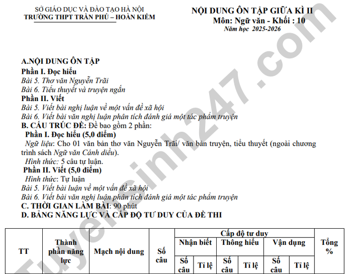 Nội dung ôn tập giữa kì 2 Văn lớp 10 - THPT Trần Phú-Hoàn Kiếm 2026