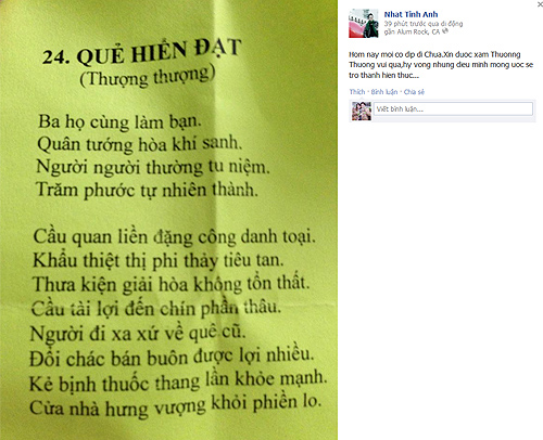 Quẻ may mắn của Nhật Tinh Anh Dù đang bận rộn với chuyến lưu diễn kết hợp cùng đón Tết Nguyên đán với gia đình ở Mỹ nhưng anh chàng Sấu Dầm vẫn không quên việc tới chùa thắp nhang cầu an và tranh thủ xin quẻ cho năm mới. Chia sẻ về quẻ mình may mắn xin được, Nhật Tinh Anh hào hứng: "Hôm nay mới có dịp đi chùa. Xin được xăm Thượng thượng vui quá. Hy vọng những điều mình mong ước sẽ trở thành hiện thực". Nam Cường