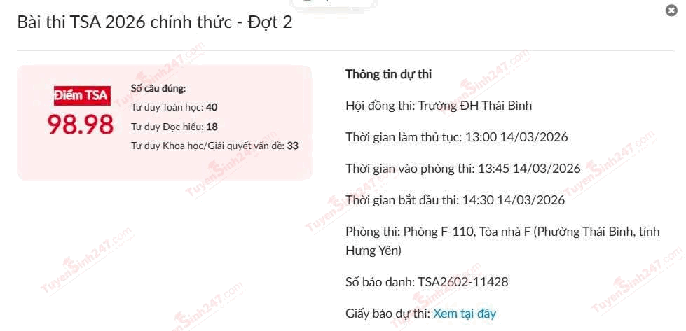 Bảng điểm TSA đợt 2 của thủ khoa Nguyễn Tuấn Đạt ĐỢT 3 KỲ THI TSA 2026 Đối với những thí sinh chưa đạt kết quả như ý hoặc chưa kịp tham gia, kỳ thi TSA năm 2026 vẫn còn 1 đợt thi cuối cùng (Đợt 3). Ngày thi dự kiến: 16 - 17/5/2026. Thời gian mở cổng đăng ký: Từ 9h00 ngày 5/4/2026 đến hết ngày 15/4/2026. Thí sinh cần đặc biệt lưu ý các mốc thời gian trên để hoàn tất thủ tục đăng ký đúng hạn trên hệ thống. Theo TTHN 🔥 2K9 CHÚ Ý! LUYỆN THI TN THPT - ĐÁNH GIÁ NĂNG LỰC - ĐÁNH GIÁ TƯ DUY!