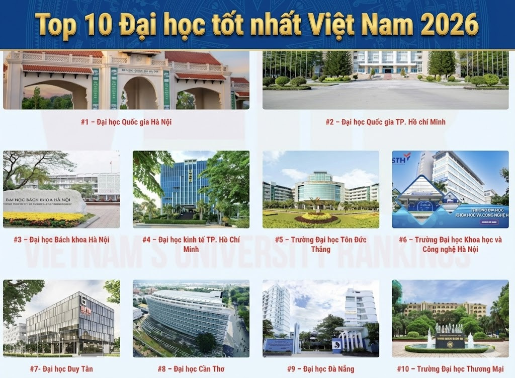 10 trường đại học tốt nhất Việt Nam 2026 Bảng xếp hạng Đại học Việt Nam 2026 (VNUR-2026) vừa được công bố. Trong kỳ xếp hạng năm nay, toàn bộ 237 cơ sở giáo dục đại học được rà soát, trong đó 193 trường có đủ dữ liệu đã được đưa vào bảng xếp hạng chính thức. Việc xếp hạng được thực hiện dựa trên Bộ tiêu chuẩn và tiêu chí VNUR-2026, gồm 6 tiêu chuẩn với 18 tiêu chí, phản ánh đầy đủ ba sứ mạng cốt lõi của giáo dục đại học: Đào tạo, nghiên cứu khoa học và phục vụ cộng đồng. Theo kết quả VNUR-2026, ĐH Quốc gia Hà Nội và ĐH Quốc gia TPHCM tiếp tục giữ vững hai vị trí dẫn đầu trong năm thứ tư liên tiếp. ĐH Bách khoa Hà Nội, ĐH Kinh tế TPHCM và Trường ĐH Tôn Đức Thắng duy trì vị trí trong nhóm Top 5 so với năm 2025.